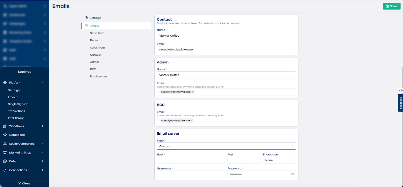 November 28, 2025 Can I use a custom email server to send mail from the portal? Yes, this is possible. You would have set the fields for the host, port, possible encryption, username, and password under 'Settings' → 'Platform' → 'Settings' → ‘Emails’ → ‘Email server’