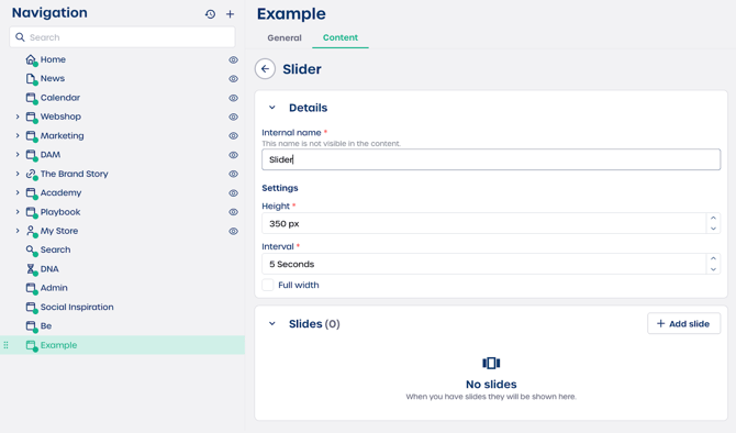 Select this option if you want the slider to span the full width of the page. If not selected, it adapts to the width of the navigation bar and content items.