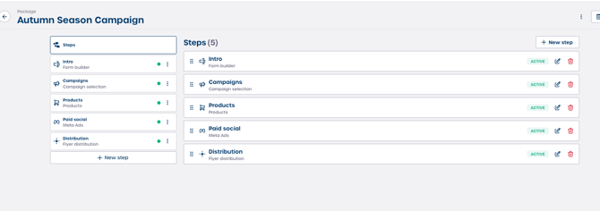 The feature or element that powers the step, such as Form builder, Products, Campaign selection, or Meta Ads.