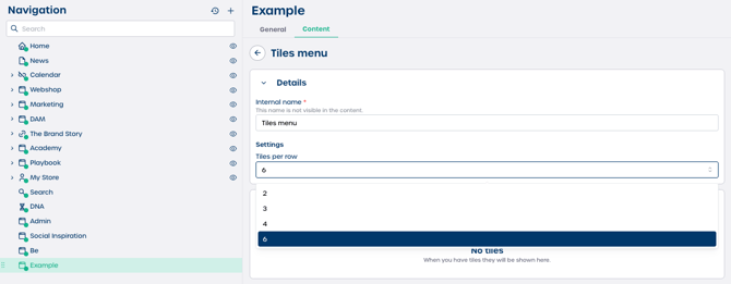 Set "Tiles per row" to choose how many tiles appear in each row. Typical options include 2, 3, 4, or 6.