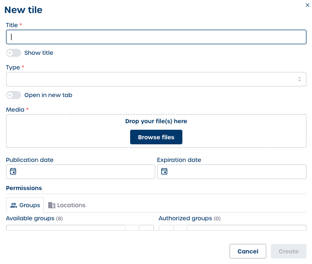 Drop your media file into the upload area or select "Browse files" to add the image that appears on the tile.