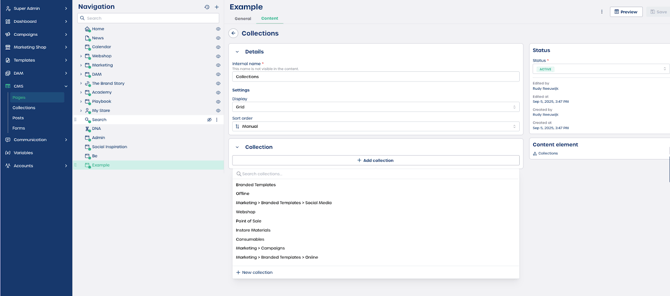 Note: Every time you add a content element, the Status panel on the right shows who created or edited it.