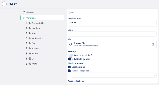 Click the Media variable you want to edit, for example "Main Image" to open the configuration panel.