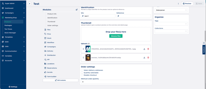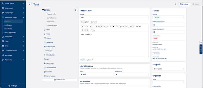 On the left side of the screen, you’ll see the Modules list. These modules are based on the preset chosen when the product was created, but you can adjust them using Edit modules.
