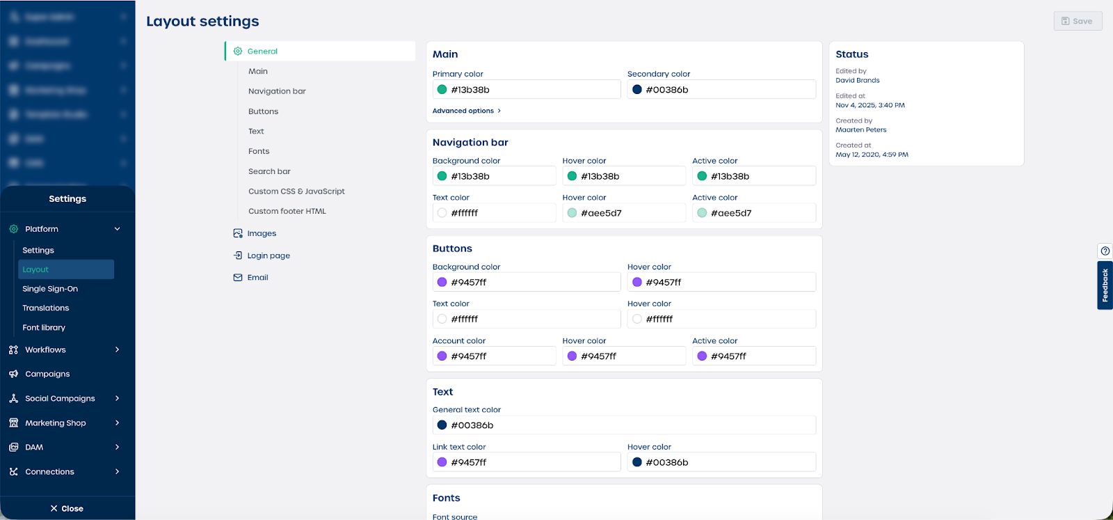 Go to 'Settings' in the left menu and select ‘platform’ and then 'Layout'. In the section 'Main' you can select accent colors, navigation bar colors, button colors, text colors and fonts.