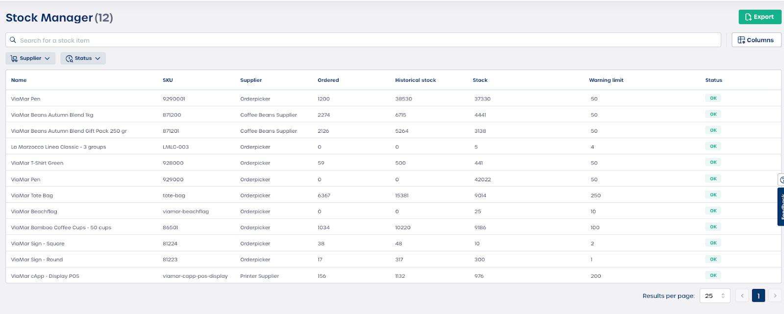 Supplier, to view items from a specific supplier such as Orderpicker or Coffee Beans Supplier